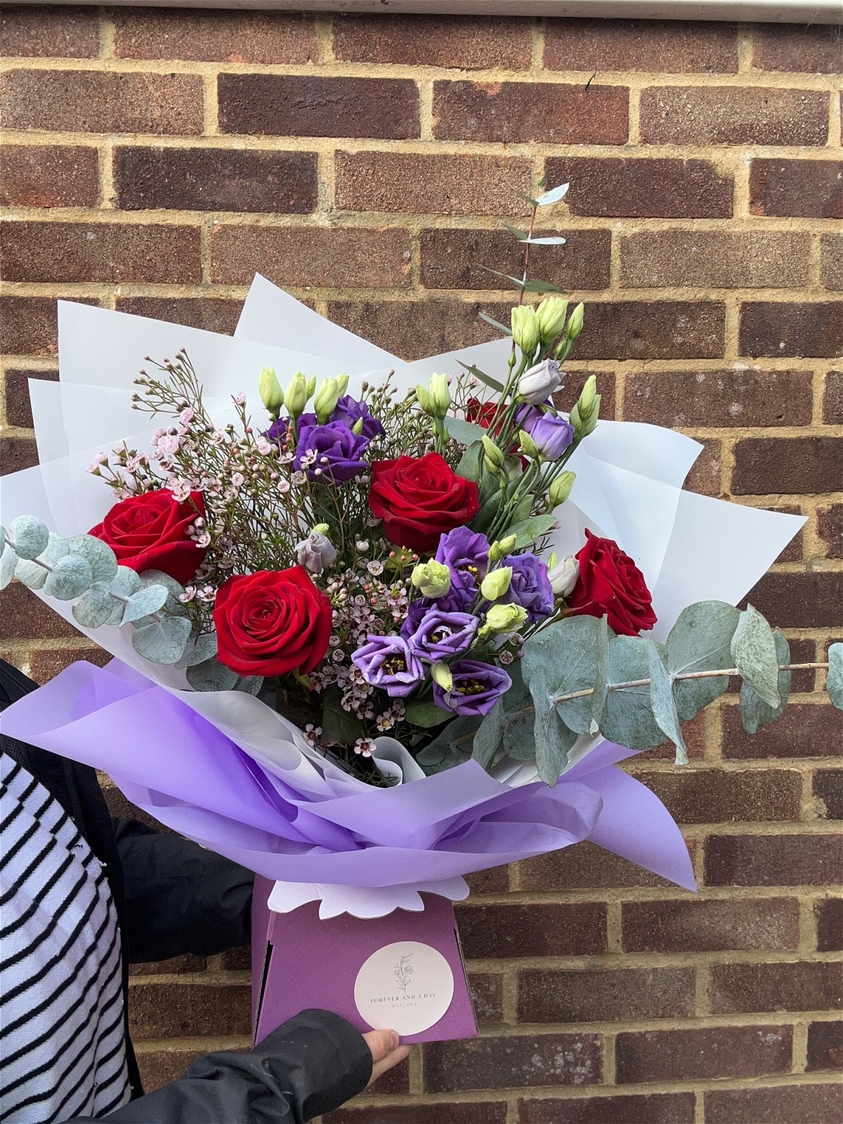 Each Red Naomi rose adds a touch of classic passion, while the purple Lisanthus symbolises beauty and grace.