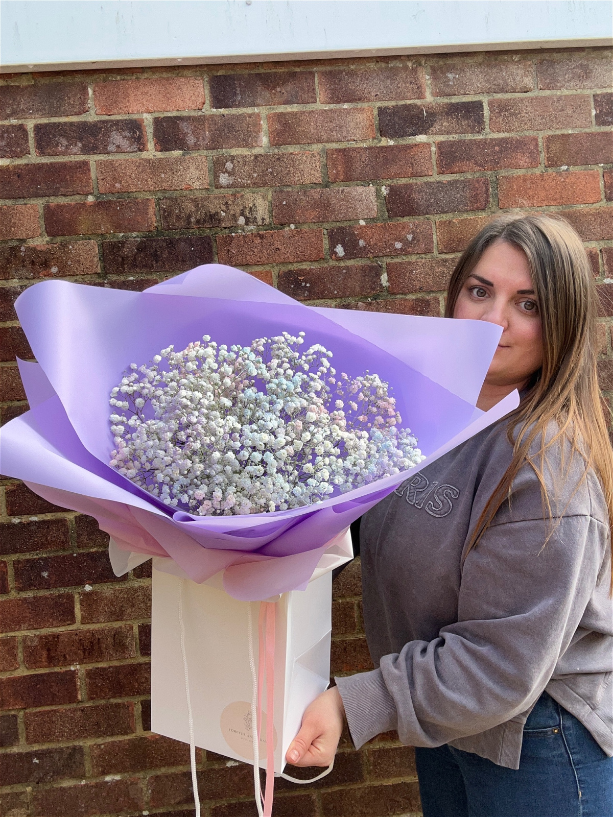 This Gypsophila Bouquet brings a soft touch of whimsy to any space. Featuring clouds of baby’s breath in gentle pastel hues of pink, pale blue, this bouquet creates a dreamy, romantic look perfect for birthdays, thank-you gifts, or brightening your home.