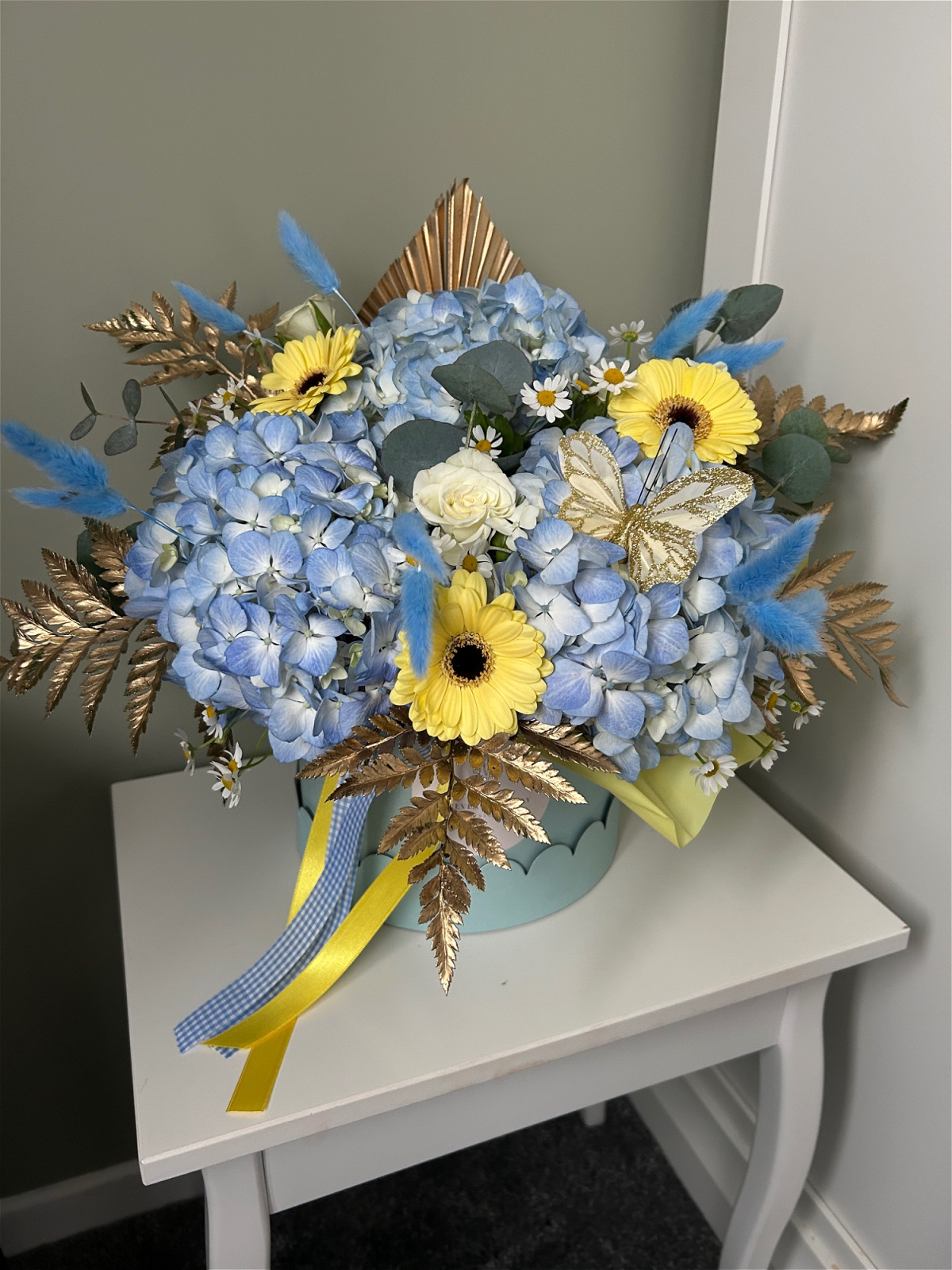 Elevate any space with our exquisite Luxe Blue & Yellow Hatbox a statement floral arrangement designed to captivate.